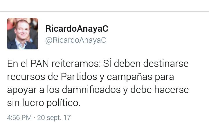 Y los hay, pues no solo Andrés Manuel López Obrador fundador de MORENA, también Ricardo Anaya Cortés del PAN y Enrique Ochoa Reza del PRI, se han pronunciado por “desviar” recursos de los partidos políticos para destinarlos al “apoyo” de los damnificados por los sismos del 7 y 19 de septiembre en nuestro país.
