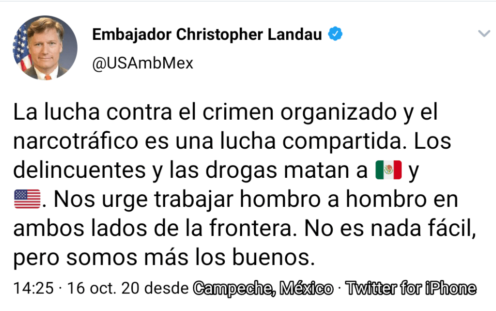Es el primer pronunciamiento que el embajador hace luego de la detención del general Salvador Cienfuegos Zepeda en el aeropuerto internacional de Los Angeles, California.