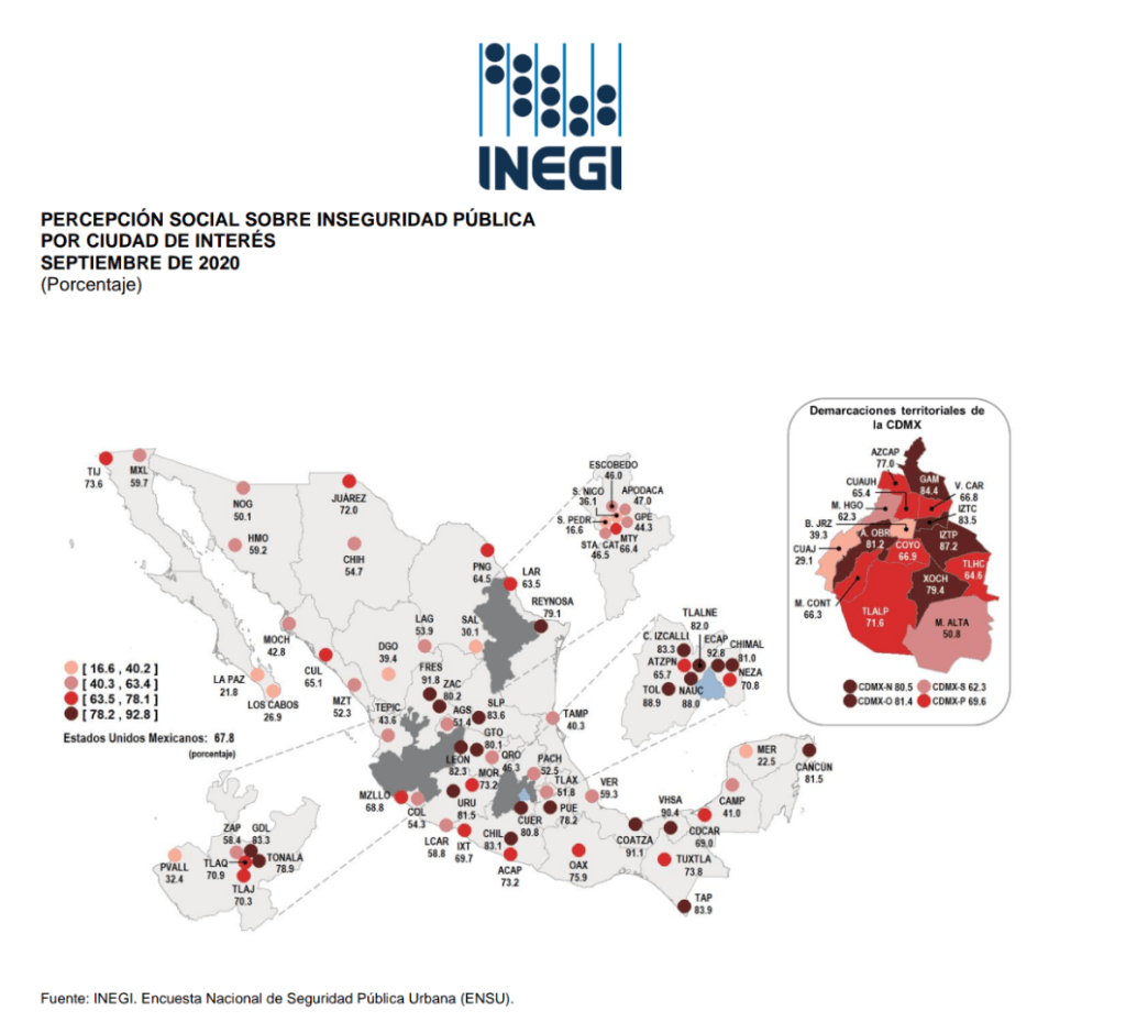 Lugares en los que más inseguridad sienten los ciudadanos: cajero automático en vía pública (78.1), transporte público (72.8%), calles que habitualmente usa (60.3%), parque recreativo (52.4%), entre otros.