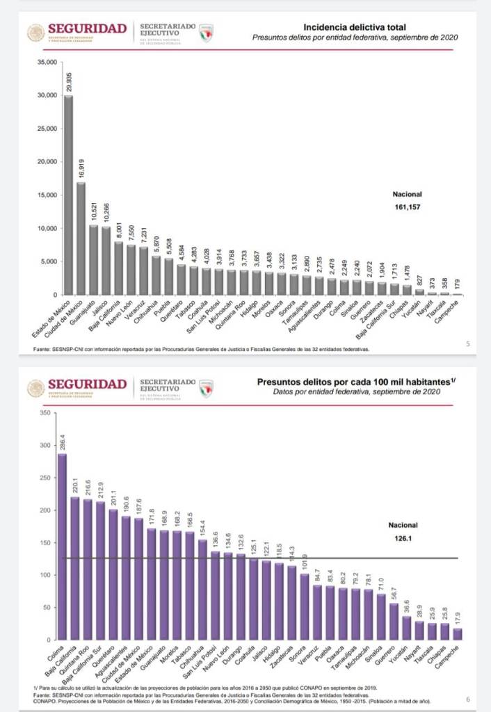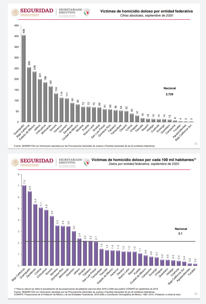 La variación de homicidio doloso respecto al mes previo, es decir, septiembre 2020 comparado con agosto 2020, en Baja California hay una disminución de -6.9 por ciento, mientras que Guanajuato registró un incremento del 20.5%, la media nacional de disminución fue de -8.4 por ciento.
