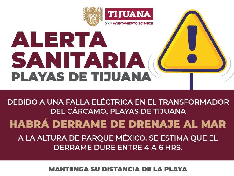 Tijuana, BC.- Debido a una falla eléctrica suscitada alrededor de la 9:00 de la noche de este martes en el cárcamo ubicado a la altura del Parque México en Playas de Tijuana, durante las próximas horas se presentarán escurrimientos de aguas negras en el mar.