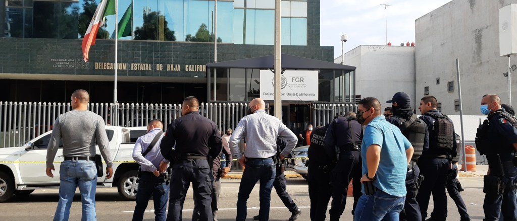 Al menos una veintena de unidades de la GESI rodean las instalaciones de la FGEBC, se dice que quieren recuperar una camioneta Tahoe que aseguraron los elementos de la Policía Ministerial Federal.