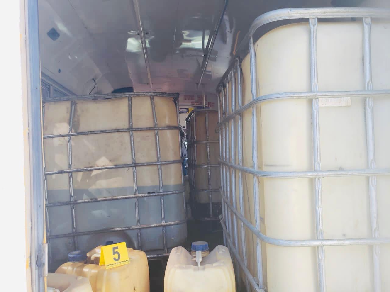 Al desahogar la diligencia, los elementos de la PFM localizaron en el domicilio tres contenedores de plástico, con capacidad para mil litros cada uno, 10 bidones de plástico, con capacidad de 20 litros cada uno y detuvieron a seis personas.