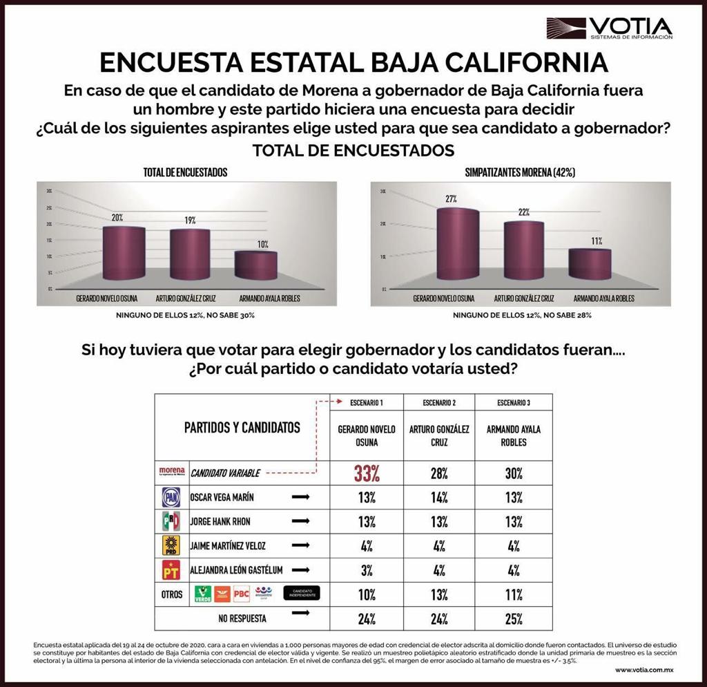 Del 19 al 24 de octubre, la Casa Encuestadora VOTIA, que dirige Felipe Quintos, realizó una encuesta “cara a cara” a 1000 personas en los cinco municipios de Baja California, para conocer las preferencias de los ciudadanos ante el próximo proceso electoral.