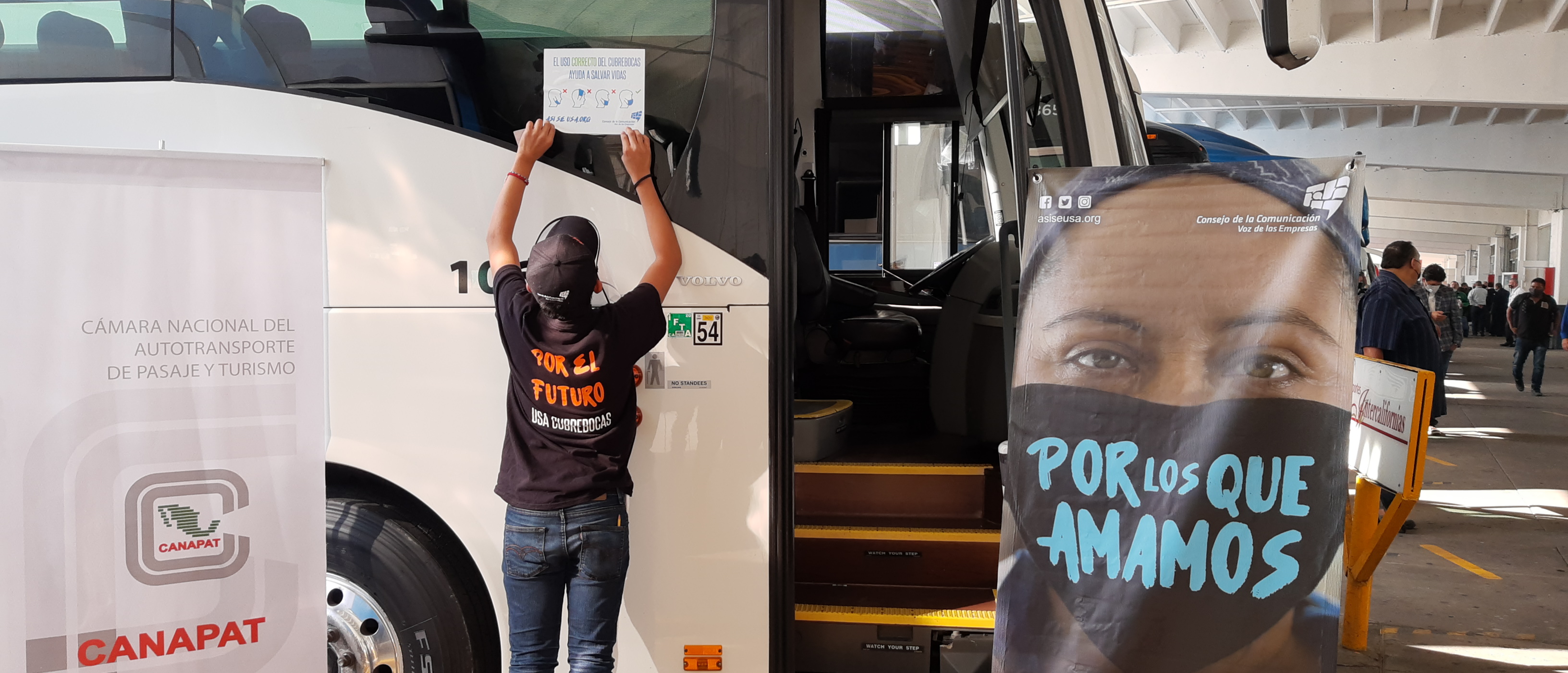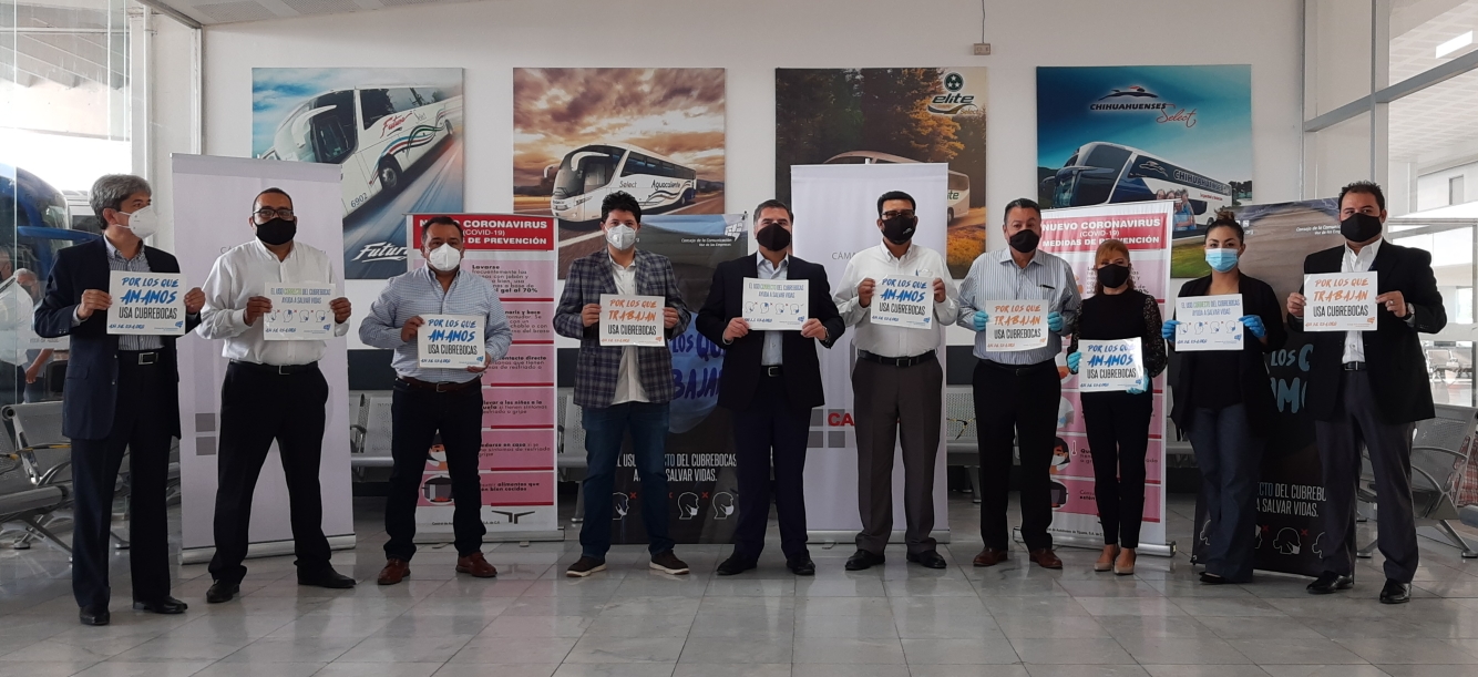 Tijuana, BC.- Para promover el uso correcto del cubrebocas, esta mañana autoridades de la Cámara Nacional del Autotransporte de Pasaje y Turismo (CANAPAT), de la Central Camionera de Tijuana, de seis líneas de Autotransporte pusieron en marcha la campaña «Así se usa».