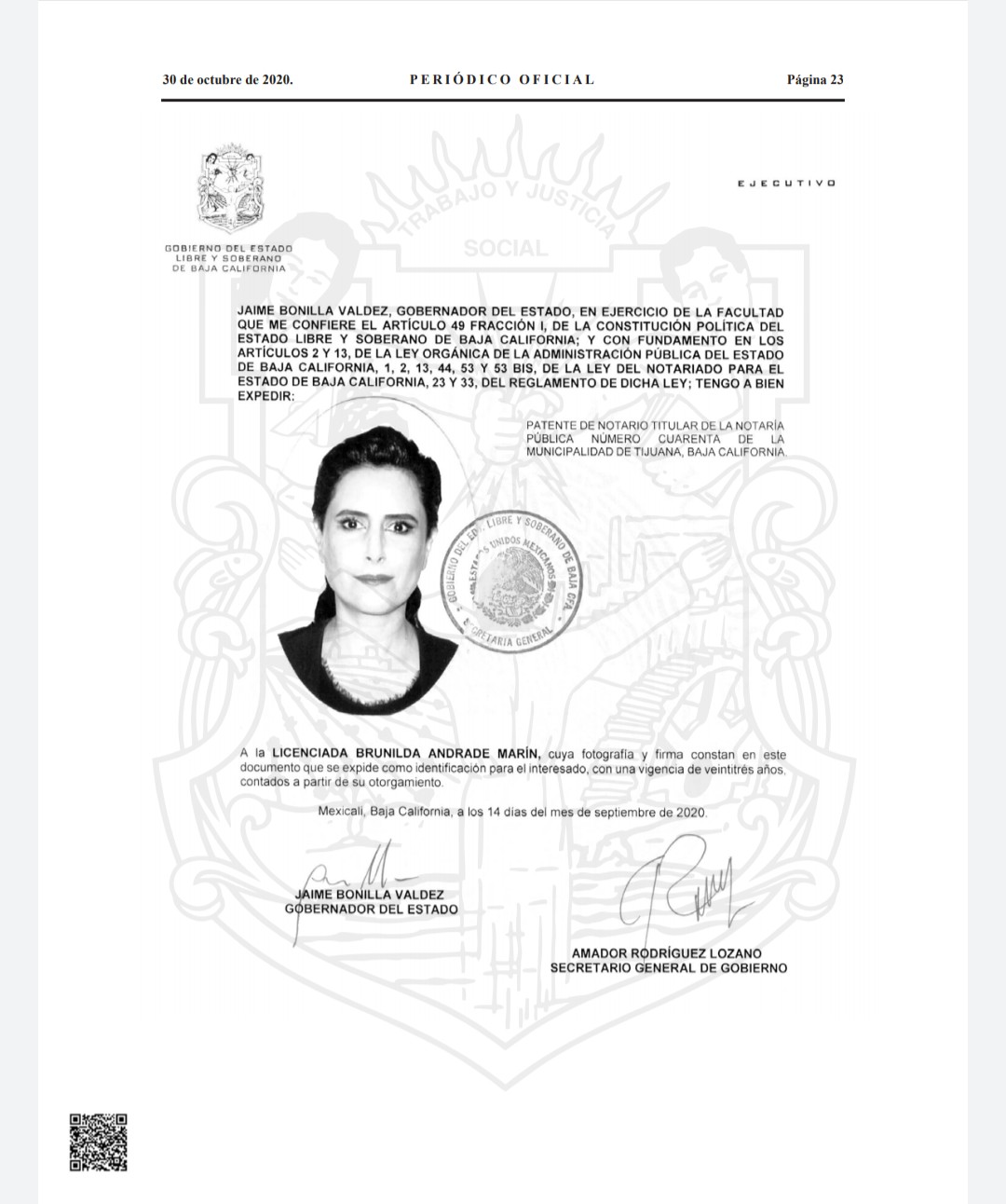 La tercera patente notarial fue para Brunilda Andrade Marín, a quien se le entregó la notaría número 40 correspondiente a Tijuana.