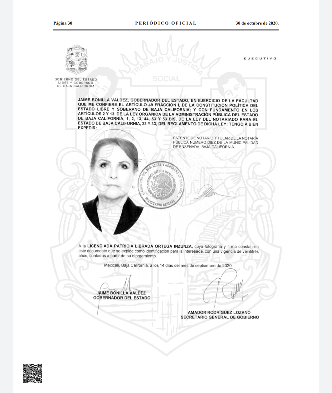 Patricia Librada Ortega Inzunza, como titular de la notaría número 10 en Ensenada. La licenciada Ortega Inzunza, fue titular de la subprocuraduría de justicia en Tecate (2013-2014) y en Playas de Rosarito(2014-2018), durante la administración del panista Francisco «Kiko» Vega de Lamadrid.