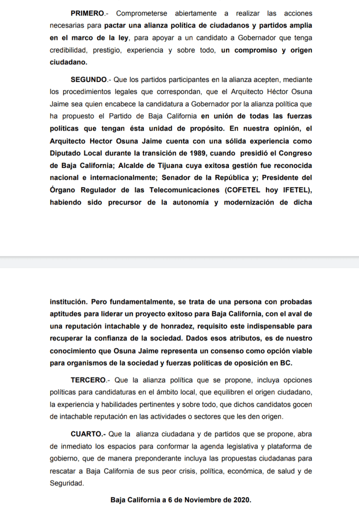 Tijuana, BC.- El Partido Acción Nacional (PAN) en Baja California propone una coalición de partidos para el próximo proceso electoral, siempre y cuando Héctor Osuna Jaime sea el candidato a la gubernatura.