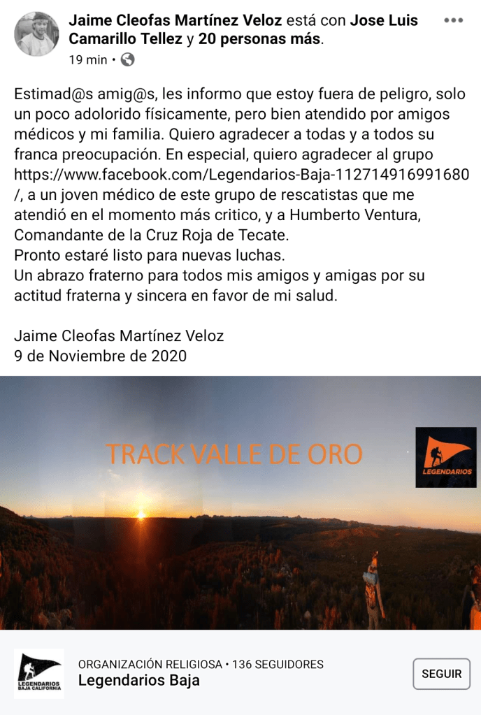 Tijuana, BC.- El arquitecto Jaime Martínez Veloz, agradeció a quienes le brindaron primeros auxilios luego del accidente carretero que sufrió en La Rumorosa.