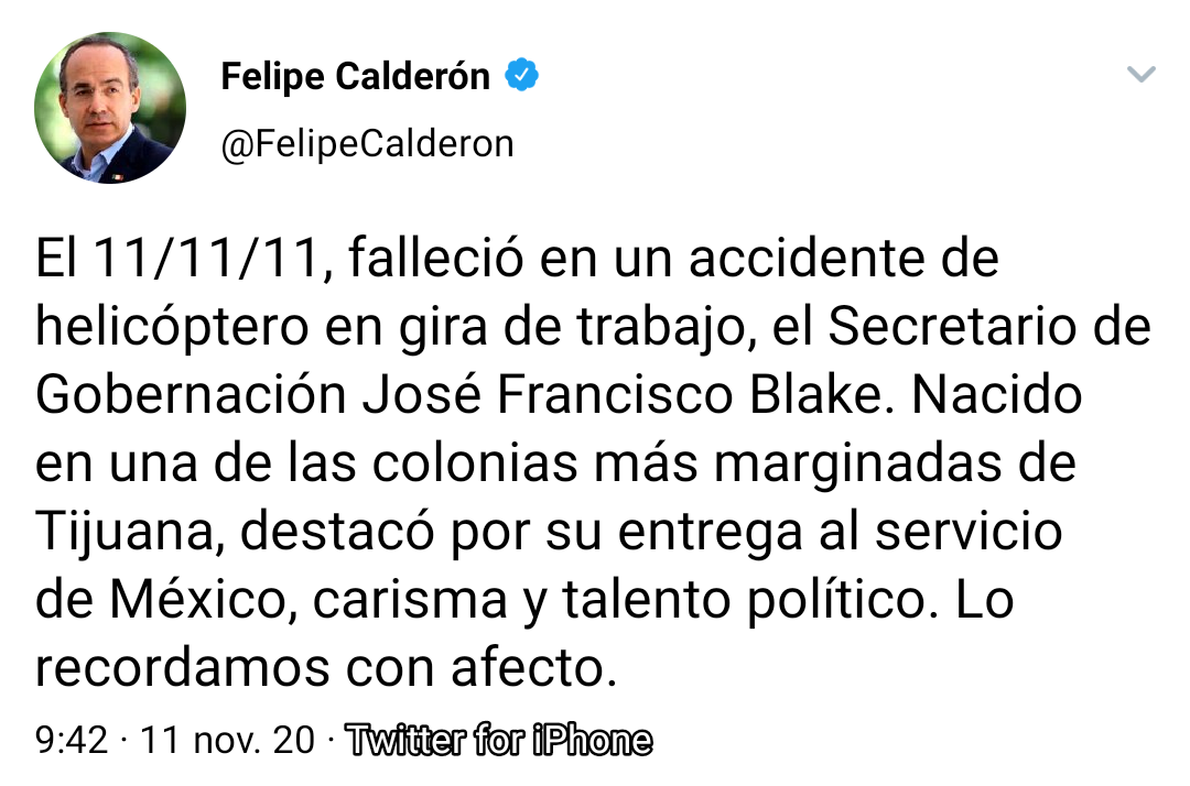 En su cuenta de Twitter, el expresidente de México, Felipe Calderón Hinojosa, le dedicó un mensaje en conmemoración de su noveno aniversario luctuoso.