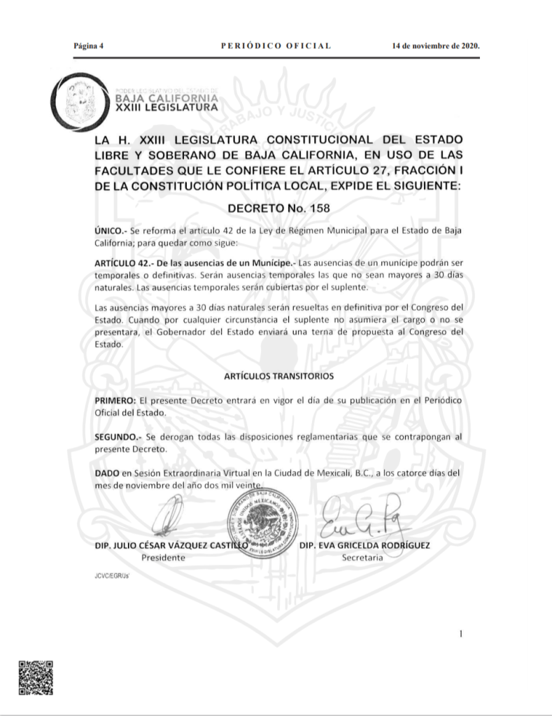 El decreto 158 del Ejecutivo, reforma el artículo 42 de la Ley de Régimen Municipal para el estado de Baja California, aprobado por 16 votos a favor y cinco en contra.