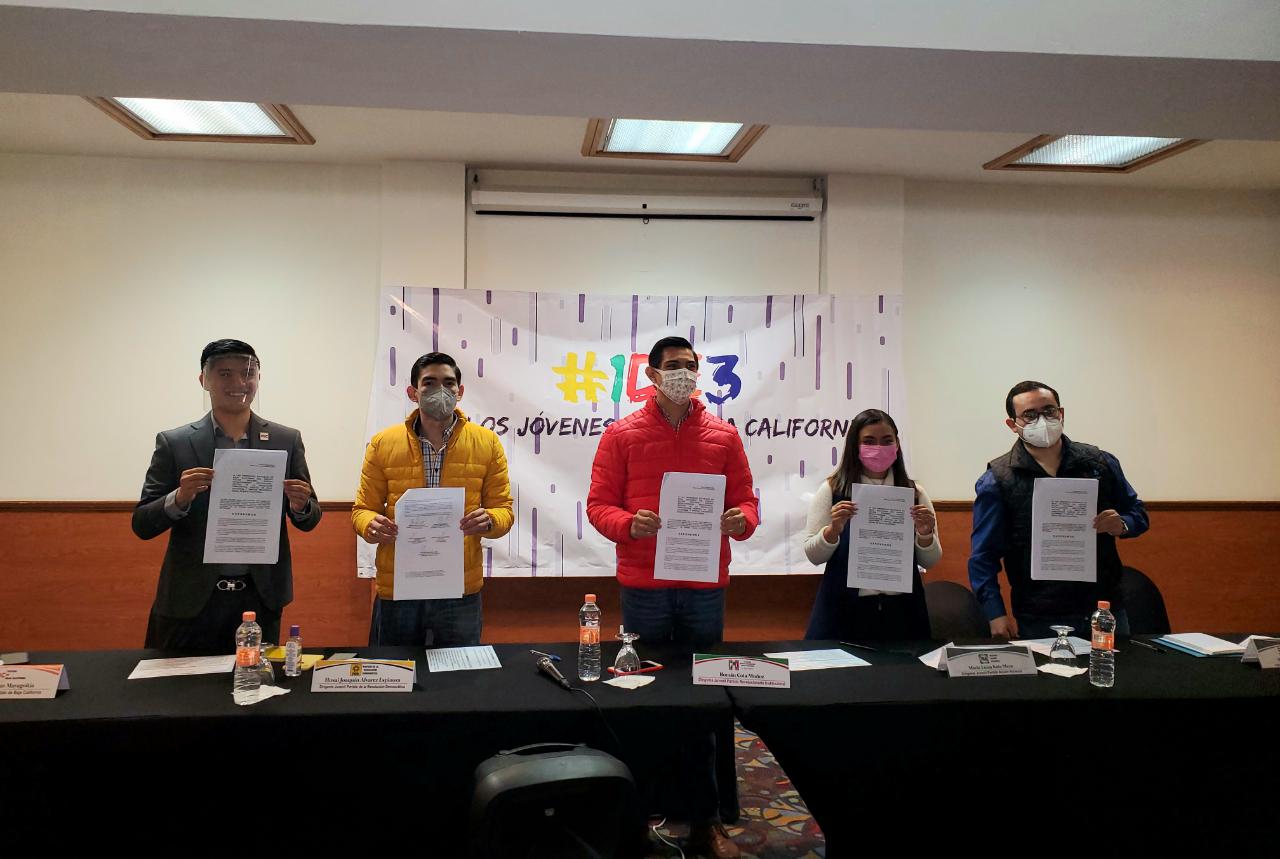 María Luisa Kato Meza (PAN), Román Cota Muñoz (PRI), Husai Álvarez Espinoza (PRD), Juan Antonio Mayagoitía Galicia (PBC) y Ricardo Sandoval Chon (PES), expusieron el documento que dictamina el acuerdo entre los diferentes organismos juveniles que representan, con la petición de promover 1 de 3 en cada una de las candidaturas y espacios de gobierno, toda vez que se vislumbra la posibilidad de una alianza opositora.