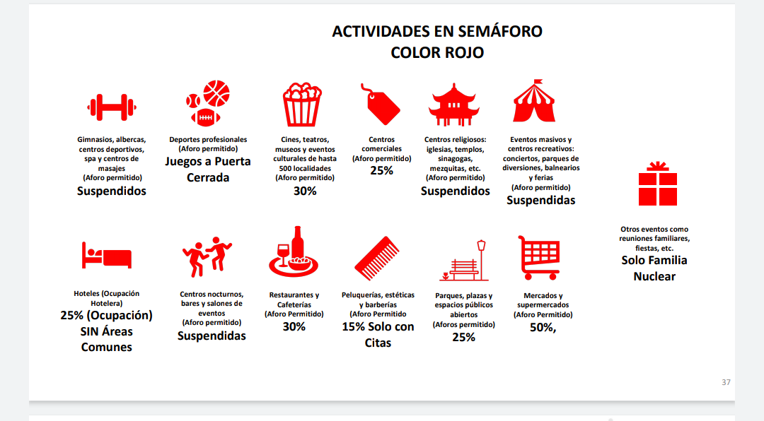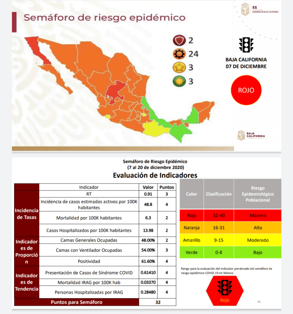 La evaluación de indicadores de riesgo epidémico, alcanzó los 32 puntos, por lo que Baja California se encuentra en el rango máximo, de ahí que permanecerá en esta coloración del 7 al 20 de noviembre.