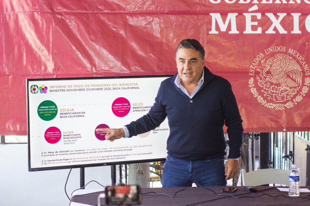 Tijuana B.C.- Pese a la situación de la pandemia del Covid-19, se tuvo un porcentaje de más del 95% de alcance de pago a los beneficiarios de las pensiones de Adulto Mayor y de personas con discapacidad, informó en conferencia de prensa, el Delegado Federal Único de Baja California, Jesús Alejandro Ruiz Uribe.