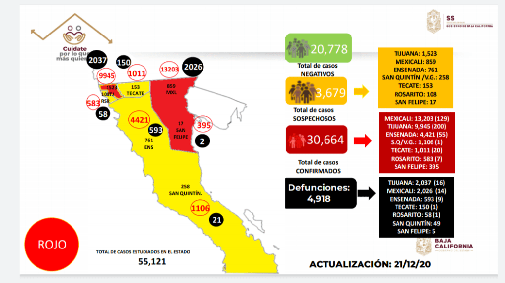 En Baja California ya hay más de 30 mil casos confirmados acumulados y casi cinco mil defunciones por covid19. El semáforo epidemiológico se mantiene en color rojo.