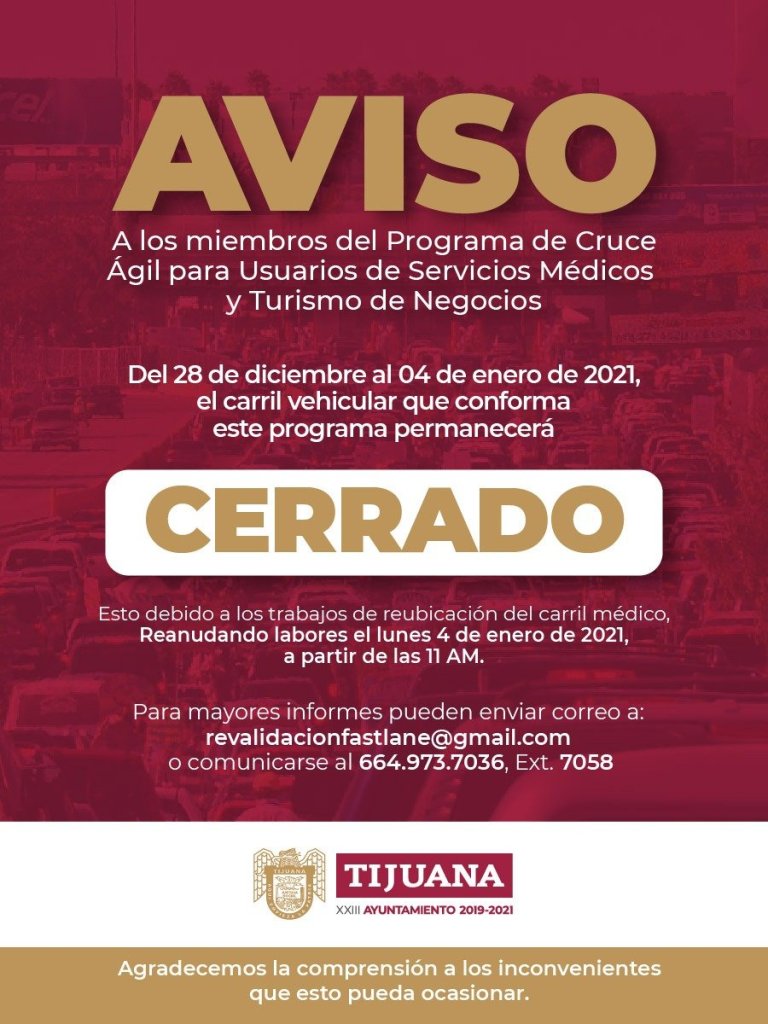 Tijuana, BC.- El presidente municipal, Arturo González Cruz, informa a quienes conforman el Programa de Cruce Ágil para Usuarios de Servicios Médicos y Turismo de Negocios, que el carril exclusivo para este programa permanecerá cerrado del lunes 28 de diciembre al lunes 4 de enero de 2021, con motivo de la reubicación del mismo al extremo izquierdo de la garita de San Ysidro.