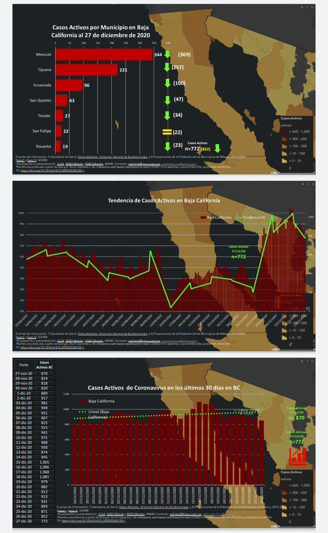 La secretaría de salud de Baja California, informó que al 28 de diciembre hay 772 casos activos de COVID-19, y ningún municipio de Baja California está dentro de los 20 municipios del país con más casos activos.