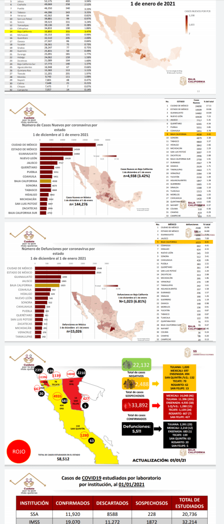 Tijuana, BC.- Entre el 1 de diciembre del 2020 y el 1 de enero del 2021, Baja California registró mil 23 muertes por covid19, lo que coloca a esta entidad fronteriza en quinto lugar nacional.