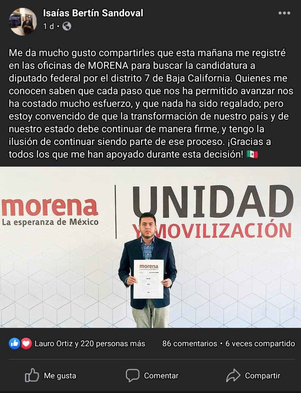 Tijuana, BC.- El aspirante a una diputación federal por MORENA, Juan Isaías Bertín Sandoval, además de ser representante de la Secretaría de Seguridad y Protección Ciudadana en Baja California, es coordinador de la dirección general en la Oficina de la Gubernatura en Baja California.