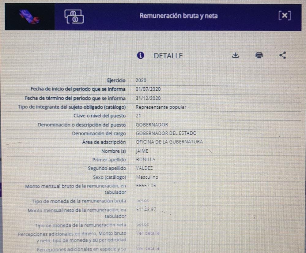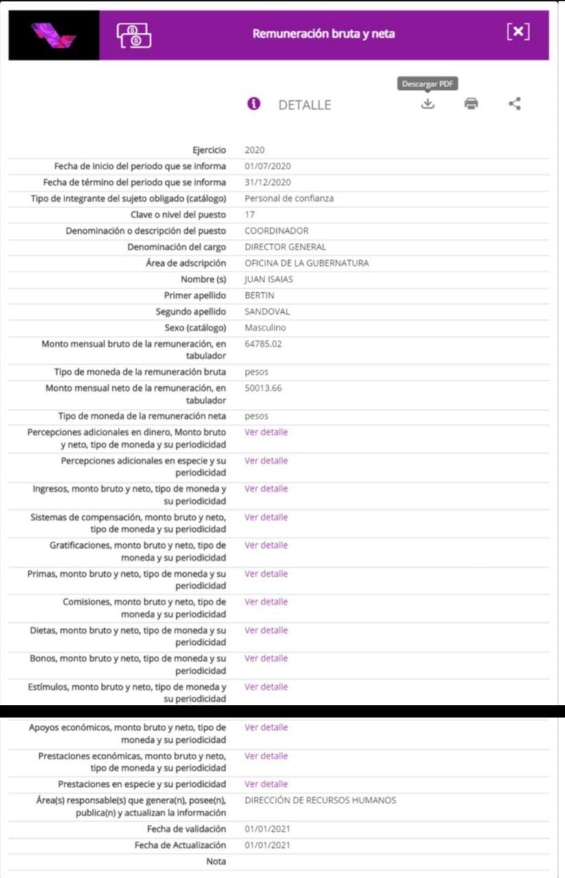 Bertín Sandoval también está adscrito a la Oficina de la Gubernatura de Baja California, aquí despacha como coordinador en la dirección general, con un sueldo de 64 mil 785.02 pesos al mes, un salario de mil 882.03 pesos menor al del gobernador de Baja California, revelan datos del portal de transparencia.