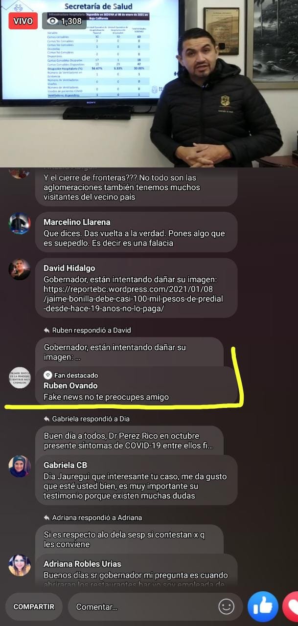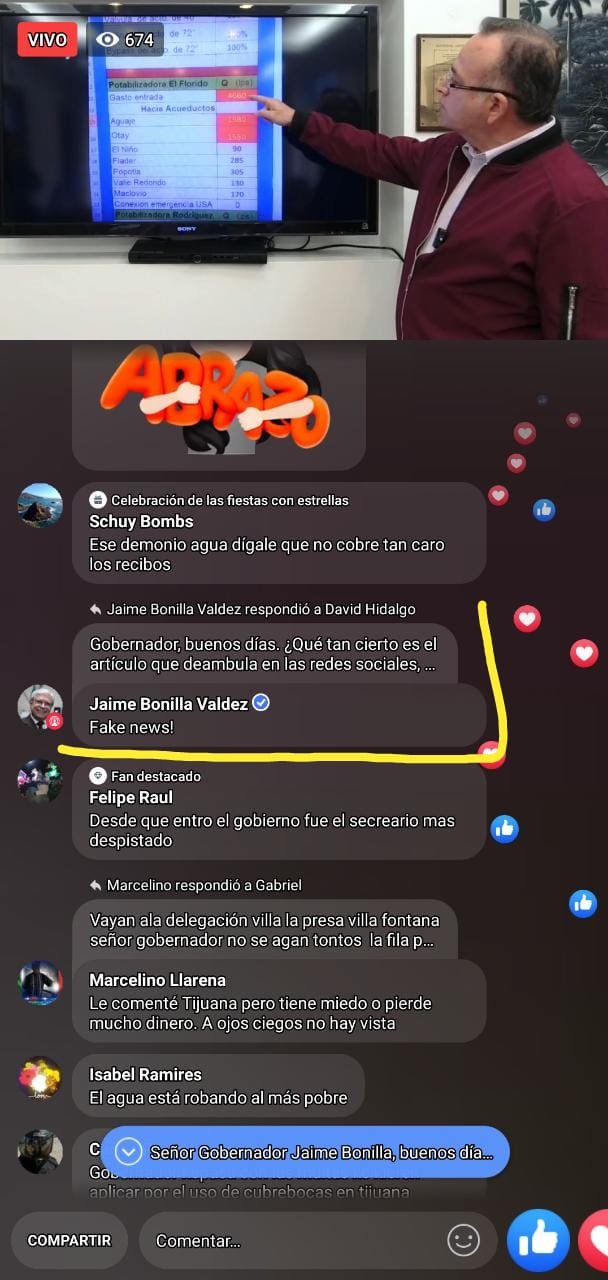 Otros usuarios también enviaron mensajes cuando Bonilla Valdez hacía su facebook live, desde la cuenta certificada (paloma azul) del mandatario hubo una respuesta: «Fake news».