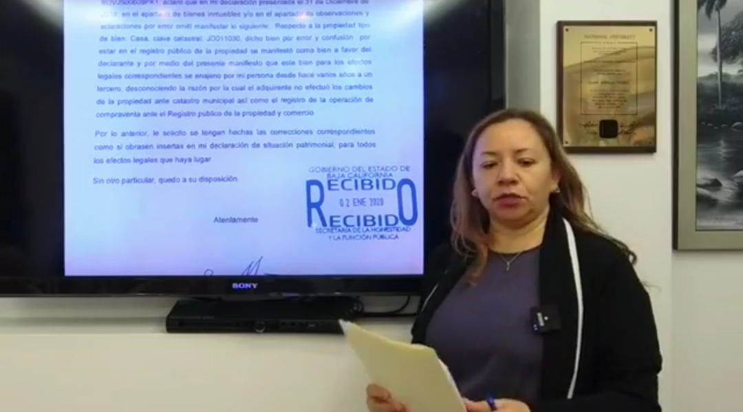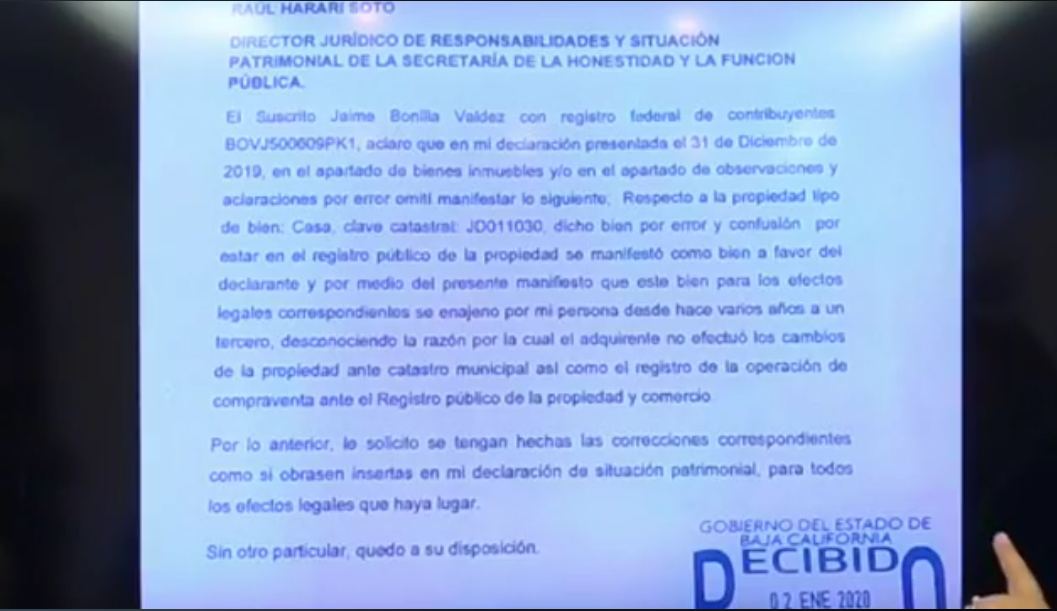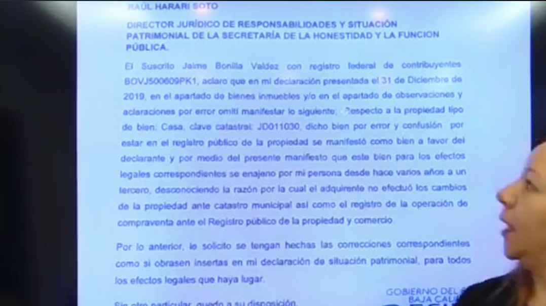 La carta que mostró Vicenta Espinosa y que es de hace un año, va dirigida al director jurídico de responsabilidades y situación patrimonial de la Secretaría de Honestidad y Función Pública del gobierno de Baja California y en ella se explica: «El suscrito, Jaime Bonilla Valdez… Aclaro que en mi declaración presentada el 31 de diciembre del 2019, en el apartado de bienes inmuebles y/o en el apartado de observaciones y aclaraciones por error omití manifestar lo siguiente: Respecto a la propiedad tipo de bien: Casa. Clave catastral: JD011030, dicho bien por error y confusión, por estar en el registro público de la propiedad se manifestó como bien a favor del declarante y por medio del presente manifiesto que este bien para los efectos legales correspondientes se enajenó por mi persona desde hace varios años a un tercero…»