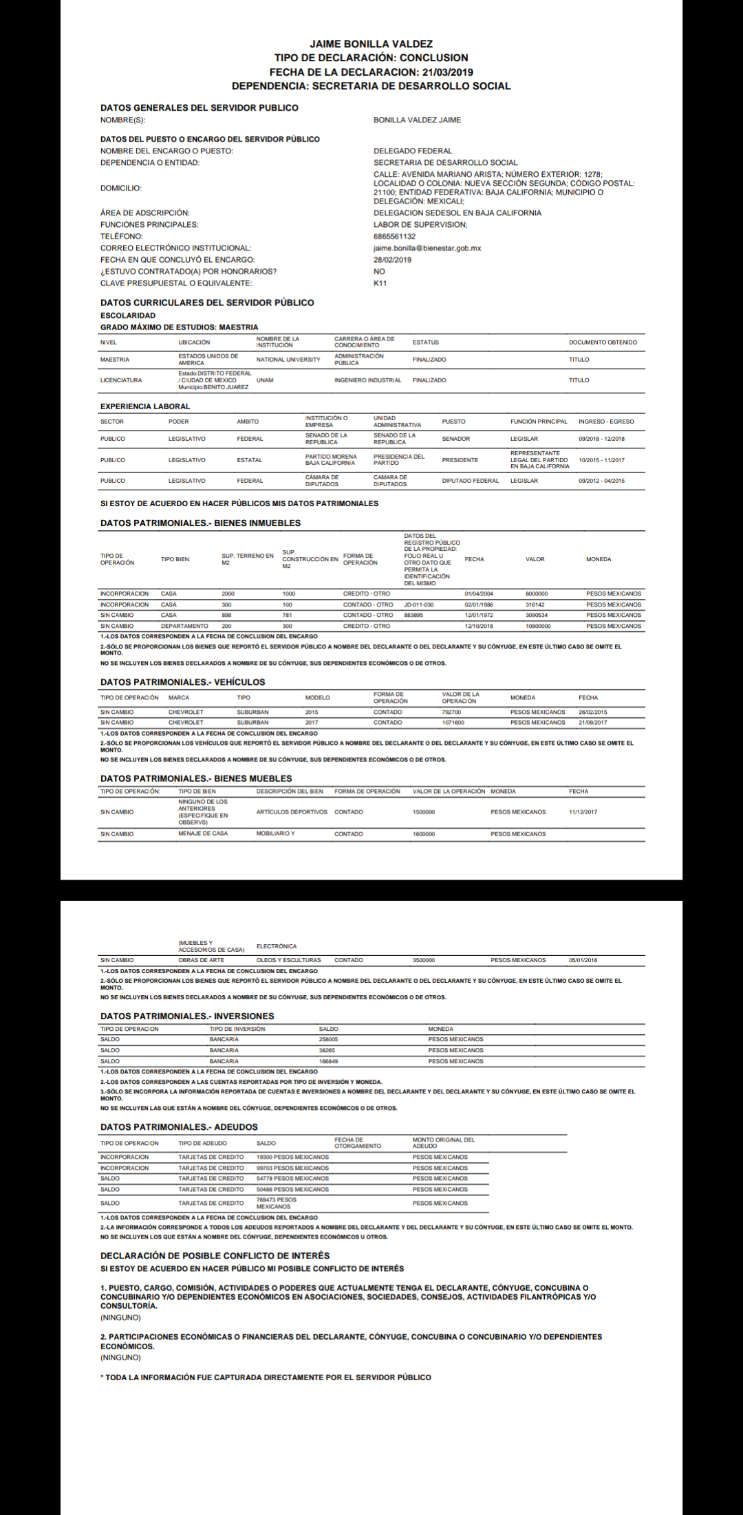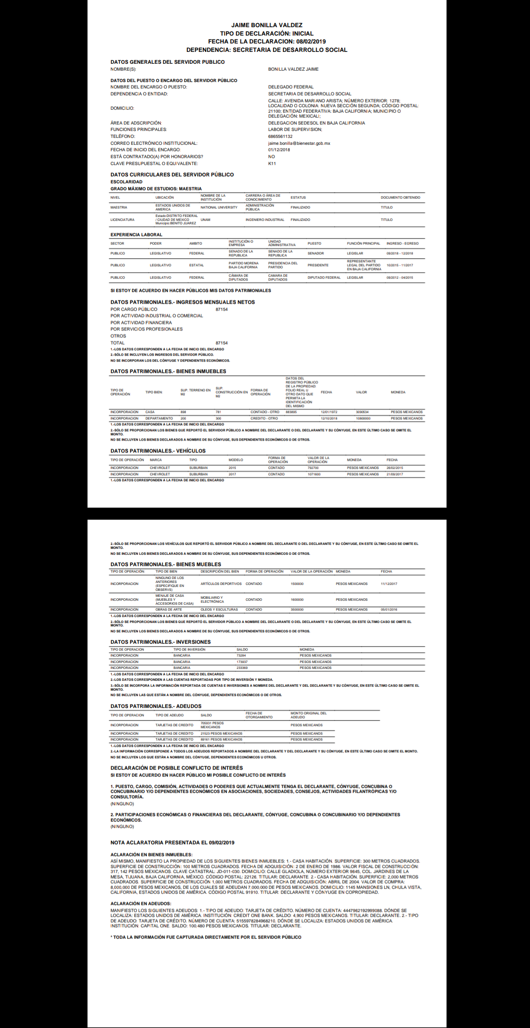Sin embargo, en la declaración patrimonial inicial de Bonilla Valdez, presentada el 8 de enero del 2019, es donde se hace la nota aclaratoria el 9 de enero del 2019 y que a la letra dice: