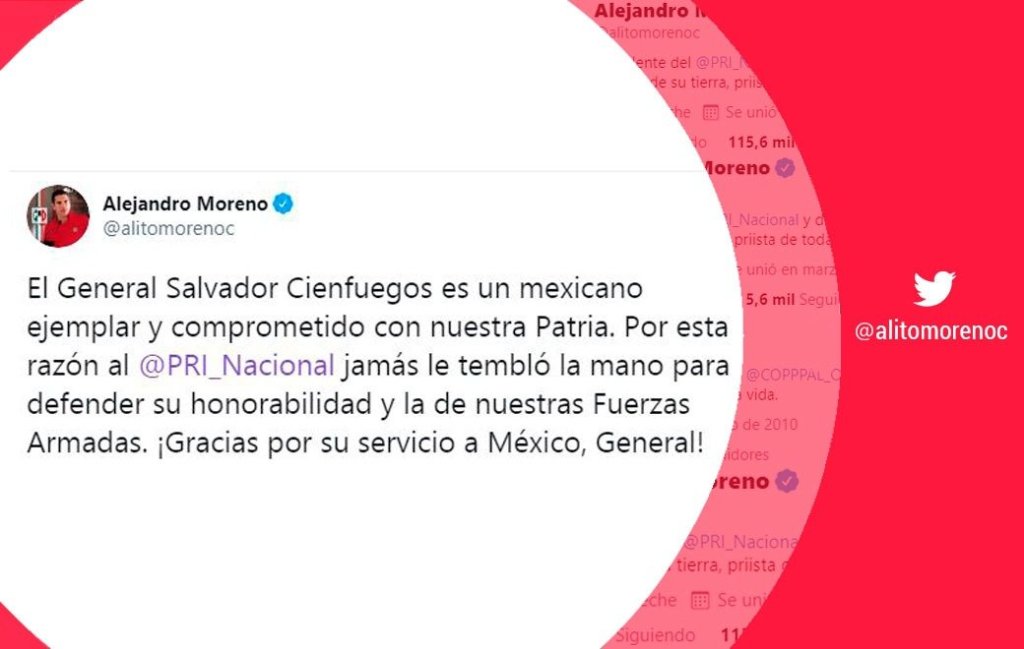En sus redes sociales, el dirigente priista agradeció a Cienfuegos Zepeda por su servicio a México. Desde octubre del año pasado, después de su detención por la DEA, el partido tricolor manifestó su confianza en el exfuncionario y le dio su respaldo.