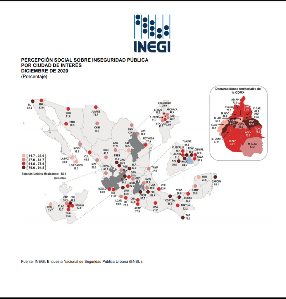 La medición a diciembre 2020, que se publicó este 19 de enero del 2021 indica que en Tijuana la percepción social de inseguridad pasó de 73.6% en septiembre 2019 a 82.4% en diciembre del 2020.
