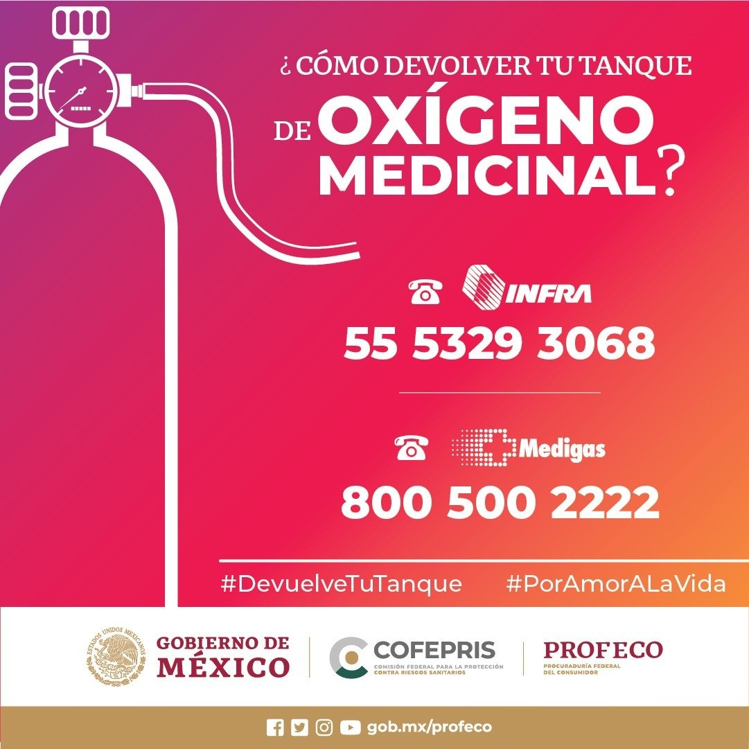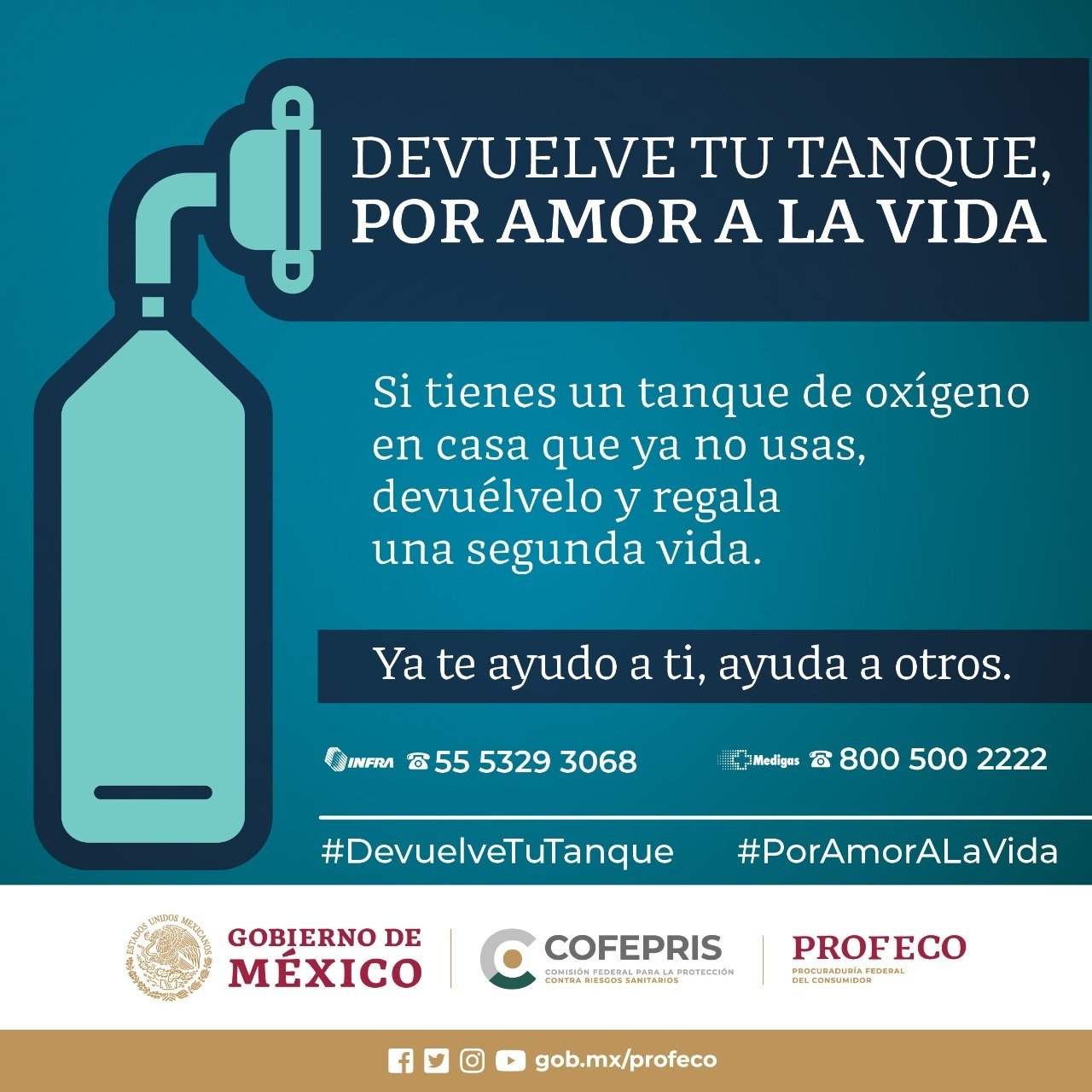 Tijuana. – La Procuraduría Federal del Consumidor (Profeco), en colaboración con la Comisión Federal para la Protección contra Riesgos Sanitarios (Cofepris) de la Secretaría de Salud, y las empresas productoras y distribuidoras de oxígeno medicinal Grupo Infra y Medigas, inician la campaña “Devuelve tu tanque. Por amor a la vida”.