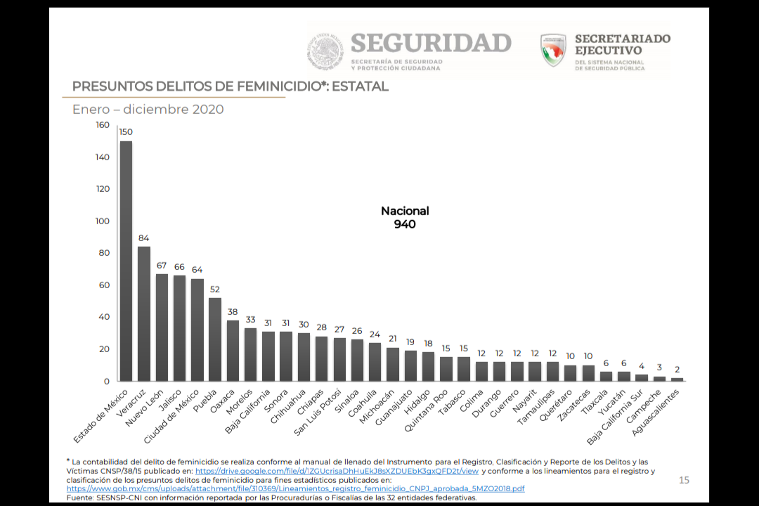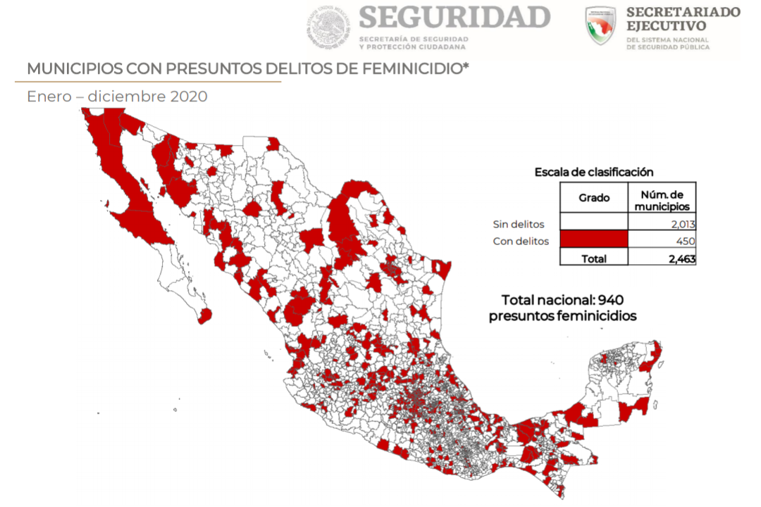 De acuerdo con las cifras del Secretariado Ejecutivo, en el 2020 se cometieron 940 feminicidios, dos menos en el 2019, pero 47 más que en el 2018 cuando se registraron 893 feminicidios en el país. En el 2020 Baja California ocupó el noveno lugar nacional con mayor cantidad de feminicidios, con un total de 31.