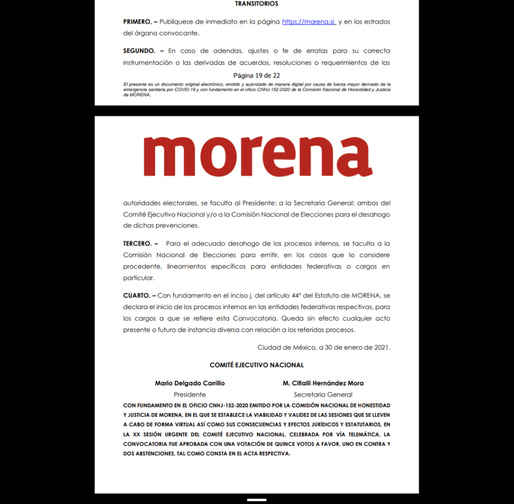 A través de su Twitter, Mario Delgado, presidente nacional de MORENA expuso: Ya tenemos la convocatoria para aspirantes a diputaciones locales, presidencias municipales y diversos cargos de elección popular. En @PartidoMorenaMx cualquier militante o simpatizantes puede participar y el pueblo es quien decide. #MorenaEsDemocracia