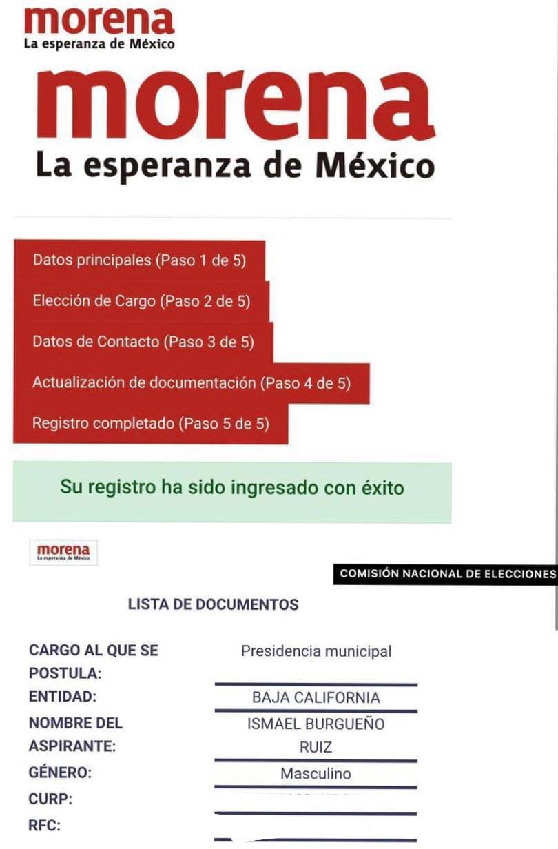 Tijuana, BC.- Ismael Burgueño Ruiz se registró como aspirante a la candidatura por la presidencia municipal de Tijuana por morena al demostrar que comparte, defiende y sostiene de la mano de la militancia, simpatizantes y ciudadanos, los valores y principios del partido colocado como la primera fuerza política del país.