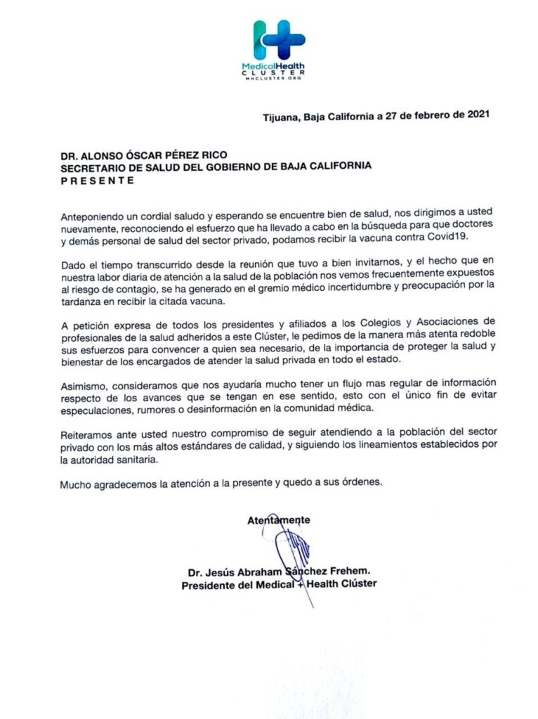 Baja California.- Mediante una carta dirigida al secretario de Salud de Baja California, Alonso Pérez Rico, el Medical + Health Clúster volvió a solicitar a las autoridades locales que el personal médico del sector privado reciba la vacuna contra el Covid-19, cuya aplicación han esperado desde el pasado mes de diciembre.