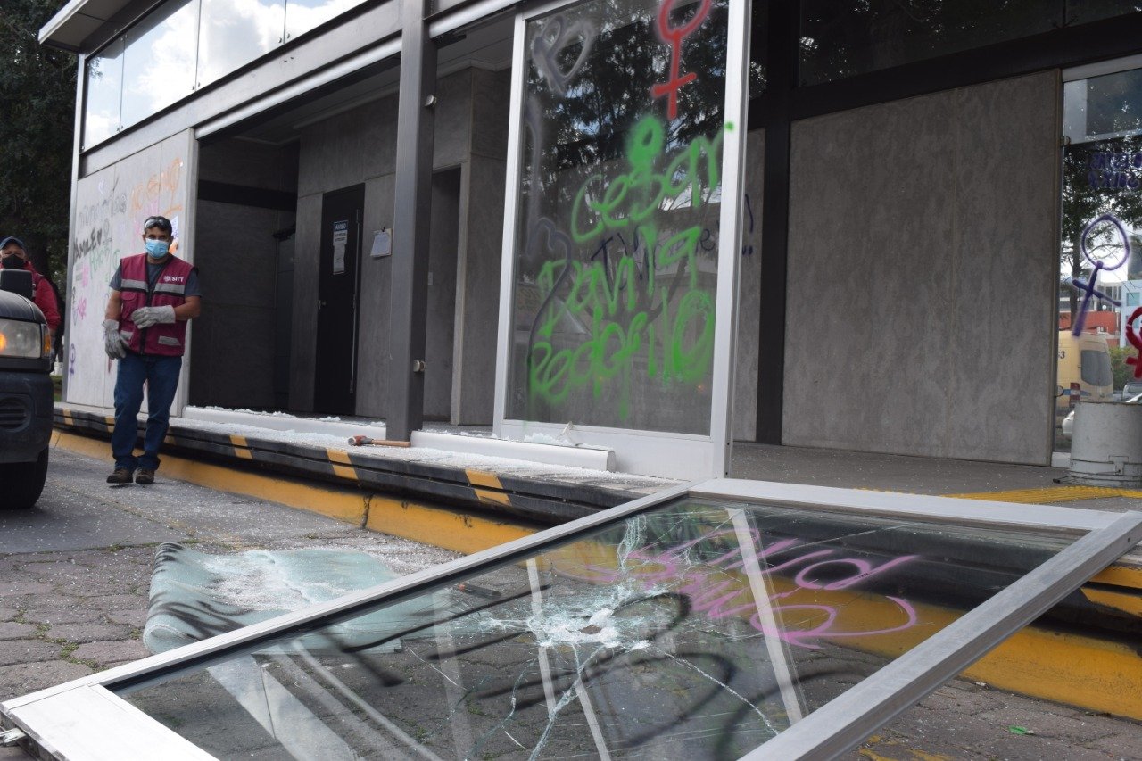 Tijuana, Baja California.- Ventanales rotos en una estación del SITT y pintas, es parte del saldo que arrojó la marcha feminista realizada ayer en el marco del #M8 «Día Internacional de la Mujer», en esta ciudad fronteriza.