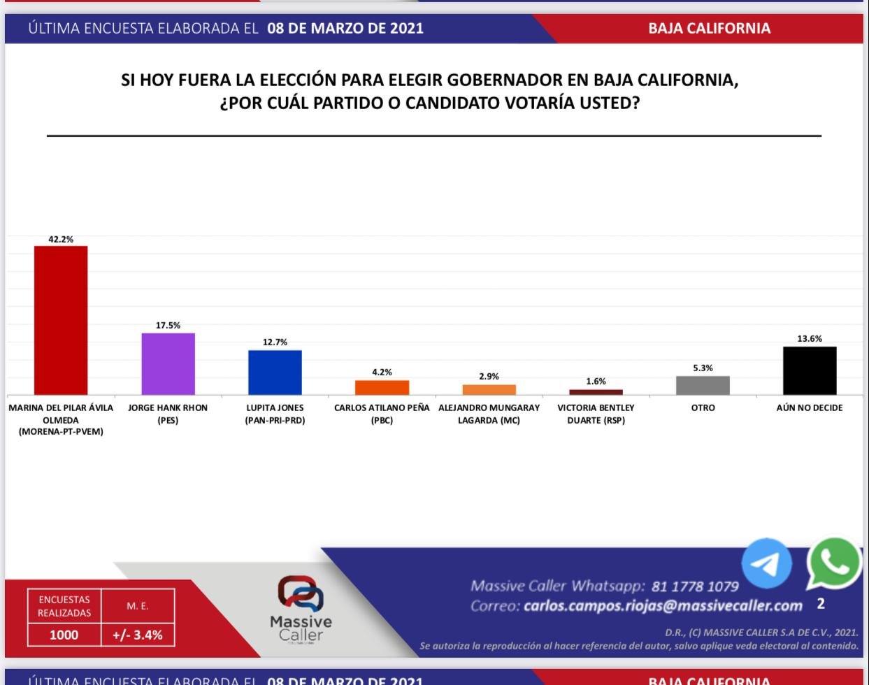 En esta medición, Marina del Pilar ganaría con una ventaja de dos a uno la elección, sin embargo, hay otra encuesta que da apenas un 2 % de margen de triunfo a la exedil mexicalense.