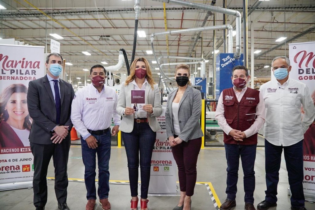 Honrando la vocación industrial del estado, la abanderada de MORENA, el Partido del Trabajo (PT) y el Partido Verde Ecologista de México (PVEM), hizo su presentación desde la empresa aeroespacial Safrain Cabin Tijuana, localizada en el Parque Industrial Pacífico, desde donde enfatizó que «no hay desarrollo económico sin desarrollo social».