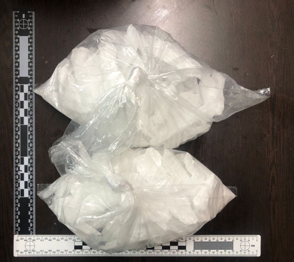 Se encontraron también dos bolsas con una sustancia solida granulada al tacto con las características similares a la droga sintética metanfetamina con un peso de 902 gramos.