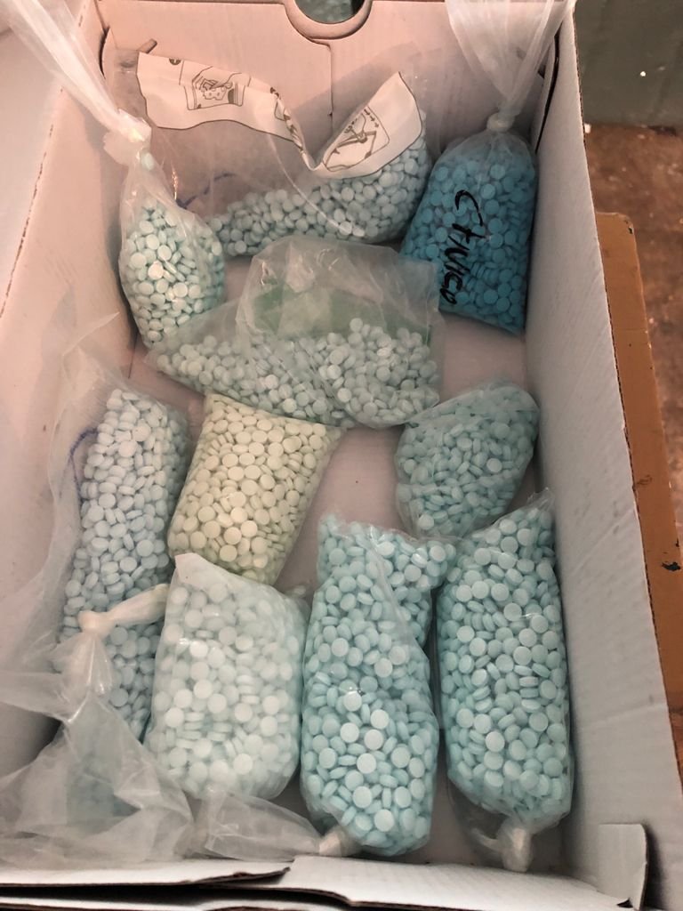 Asimismo se localizó una caja de cartón color azul con la leyenda “Polo Club” conteniendo 10 bolsas de plástico transparente, de las cuales una es con cierre hermético, que en su interior contienen múltiples pastillas circulares de color azul con la literal en una de sus caras “M” y en la otra “30”, al parecer fentanilo con un peso de 950 gramos, aproximadamente 10 mil pastillas.