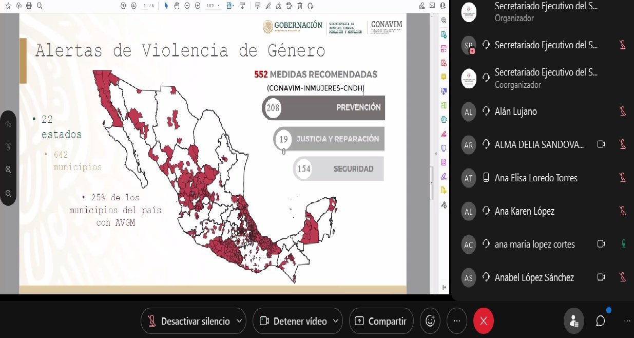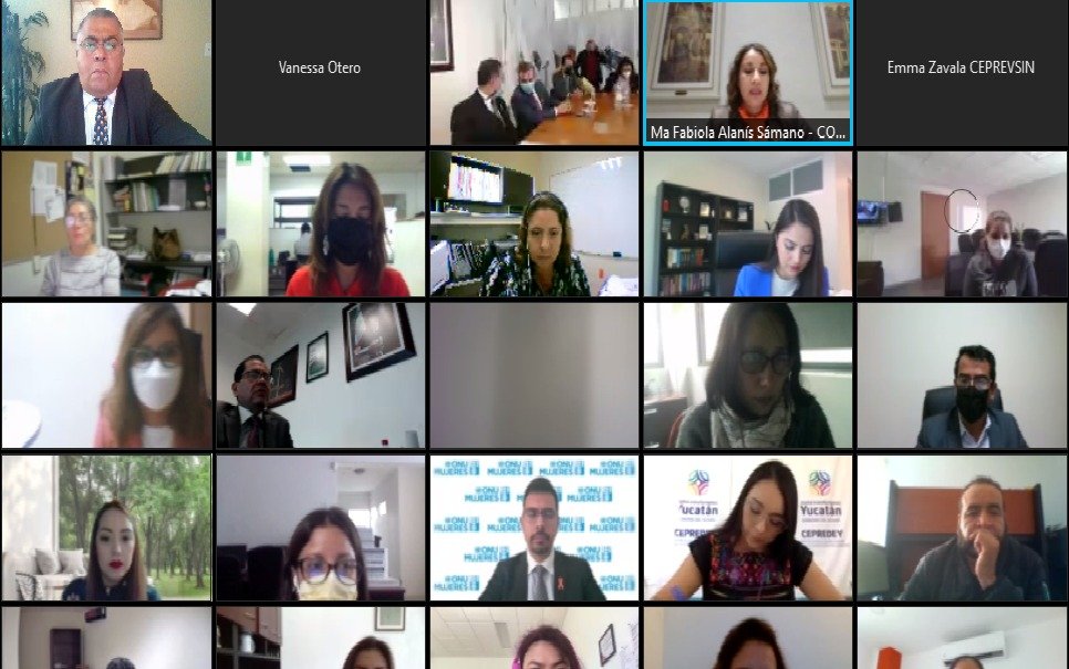 El evento se desarrolló con la participación de Leonel Cota Montaño, Secretario Ejecutivo del Sistema Nacional de Seguridad Pública, la Dra. Nadine Gasman Zilbermann, Presidenta del Instituto Nacional de las Mujeres, la Dra. Fabiola Alanís Sámano, Comisionada Nacional para Prevenir y Erradicar la Violencia contra las Mujeres, el Sr. Gerardo Camarena, Oficial Nacional en ONU Mujeres México y, el Dr. Luis García López Guerrero, Titular del Centro Nacional de Prevención del Delito y Participación Ciudadana quien dio clausura del evento que reunió a representantes de todas las entidades del país.