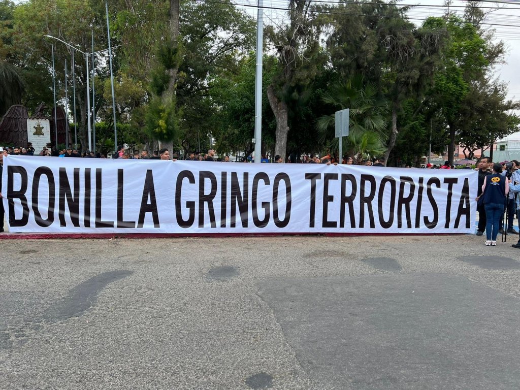 Entre los manifestantes destacaba una lona que señalaba : “Bonilla gringo terrorista”, en referencia al ex gobernador, Jaime Bonilla Valdez.