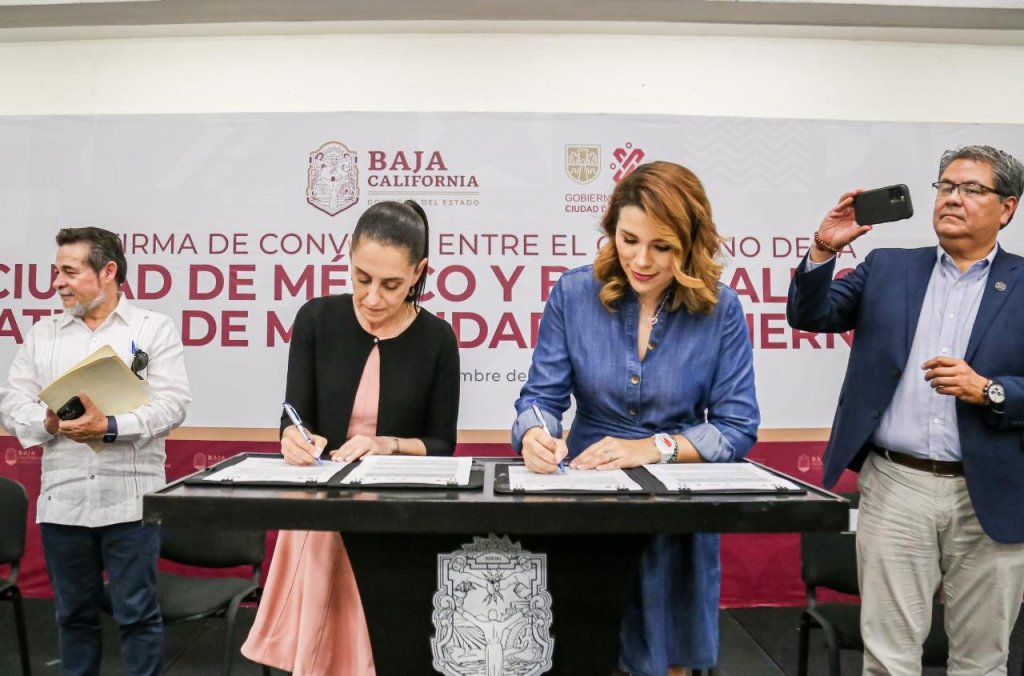 Tijuana, BC.- En un acto sin precedentes que innovará y modernizará la vida pública de las y los ciudadanos de Baja California, la Jefa de Gobierno de la Ciudad de México, Claudia Sheinbaum Pardo y la Gobernadora Marina del Pilar Avila Olmeda suscribieron el Convenio en Materia de Movilidad y Gobierno Digital, por medio del cual administración de la capital mexicana proveerá de información y asesoría destinados a impulsar diversos proyectos de innovación en el Gobierno del Estado de Baja California.