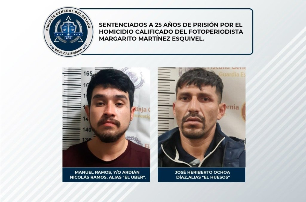 Tijuana, BC.- La Fiscalía General del Estado informó que dos de los homicidas del fotoperiodista Alfonso Margarito Martínez Esquivel, aceptaron su responsabilidad y, por ello, fueron sentenciados a 25 años de prisión dentro de la realización de un procedimiento abreviado.