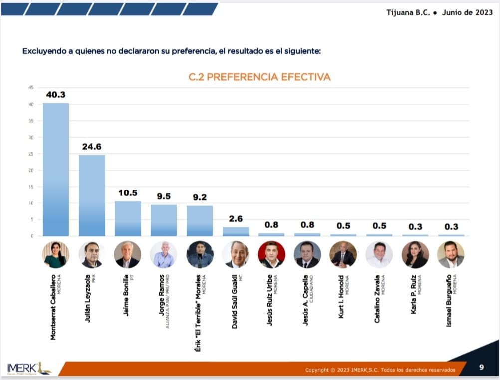 Para la firma de investigación de mercados, Caballero Ramírez obtuvo el 40.3 por ciento de preferencia efectiva, seguido por Julián Leyzaola con 24.6 por ciento y en tercera posición con el 10.5, Jaime Bonilla Valdez, ex gobernador de Baja California.