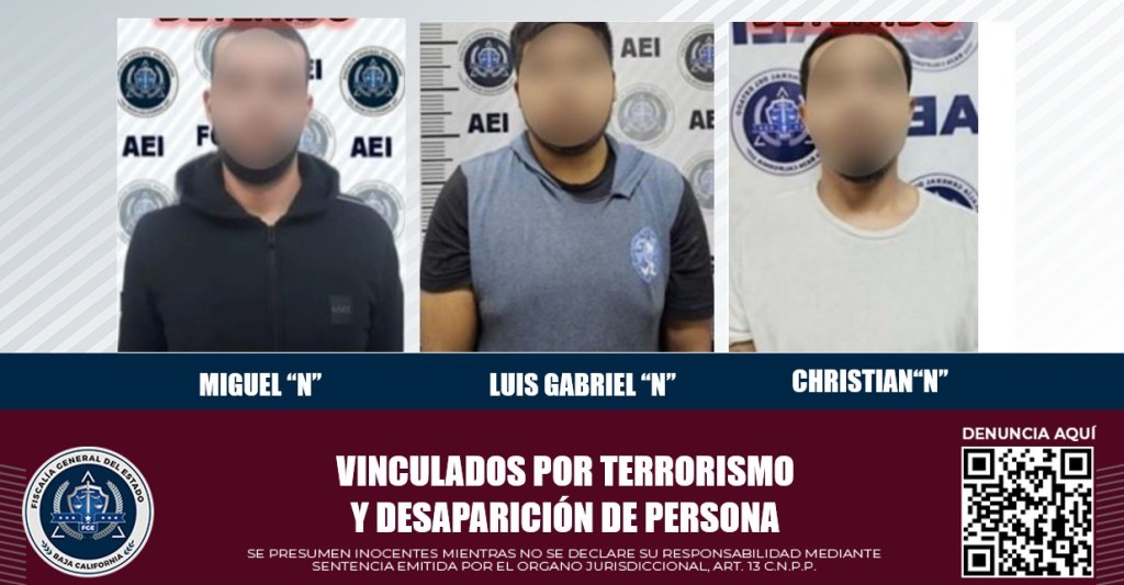 TIJUANA, BC.- En cumplimiento de su compromiso con la seguridad y el bienestar de los ciudadanos de Baja California, la Fiscal General del Estado, Ma. Elena Andrade Ramírez, informó sobre la vinculación a proceso de tres individuos acusados de los delitos de terrorismo y desaparición de persona, relacionado con lo ocurrido el 25 de febrero de 2025, cuando se recibió un reporte a través de la línea de emergencia informando el hallazgo de restos humanos junto con un mensaje escrito en un puente ubicado en la Colonia La Gloria de Tijuana.
