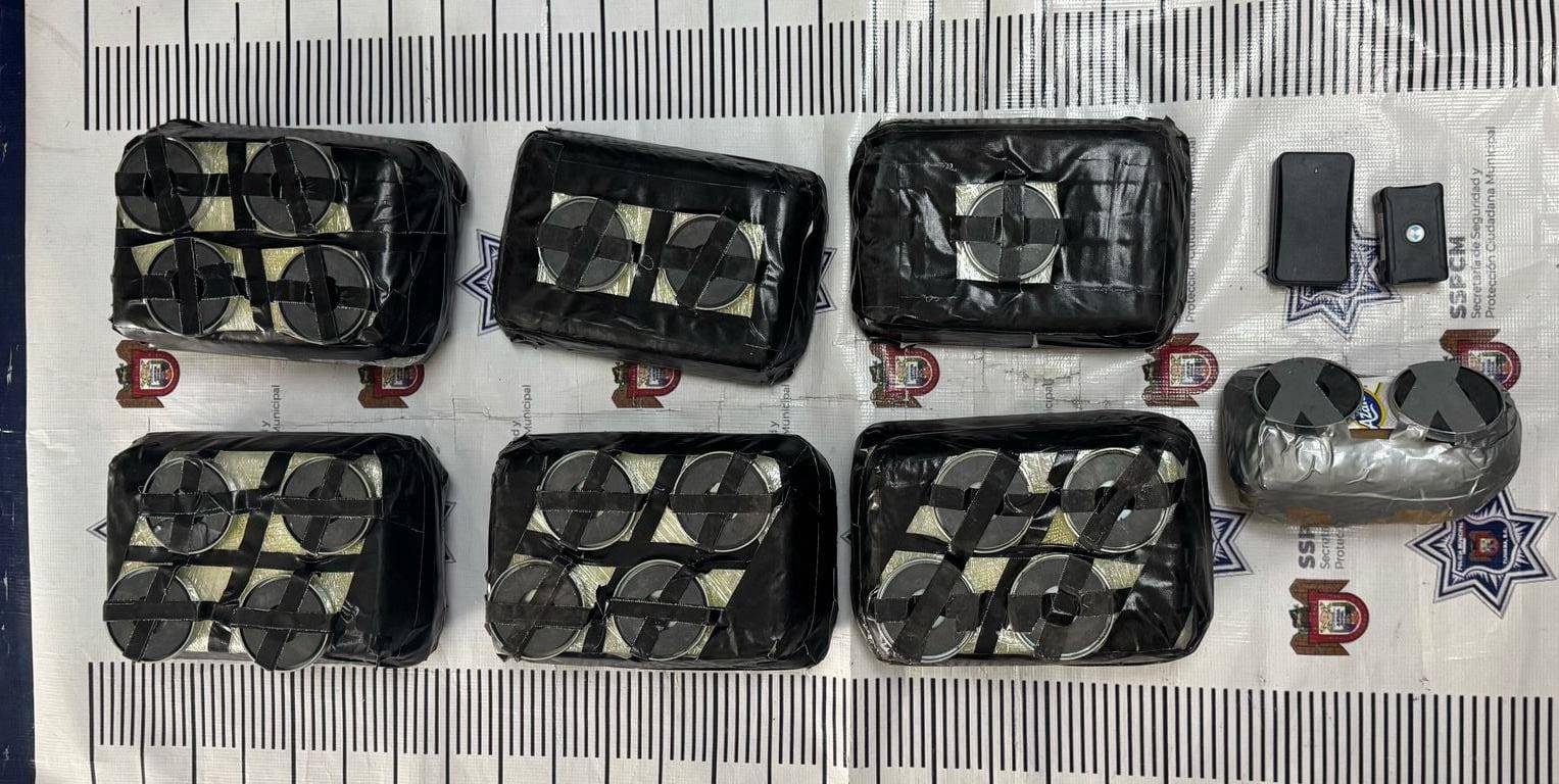 Tras la inspección, se localizaron seis paquetes rectangulares envueltos con cinta adhesiva color negra, cada uno con imanes adheridos. Dos paquetes pesaban aproximadamente 3 kilogramos y los cuatro restantes, alrededor de 6 kilogramos cada uno, conteniendo una sustancia granulada al tacto con características similares a las de la droga conocida como cristal.