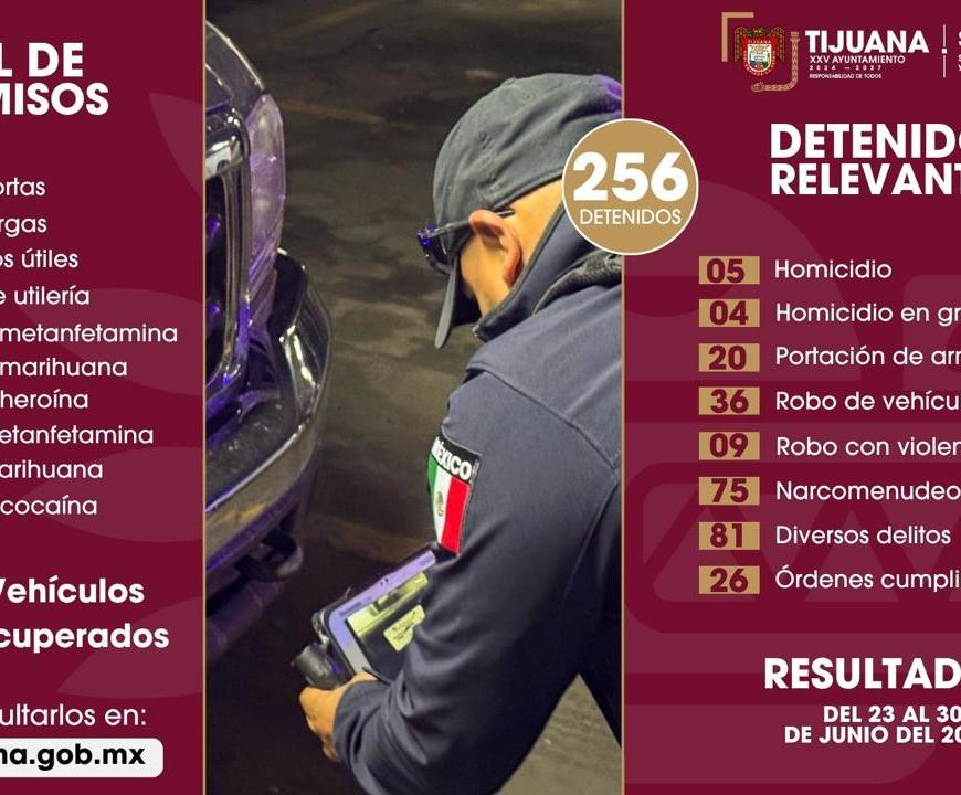 Como parte de la estrategia de seguridad impulsada por el presidente municipal, Ismael Burgueño Ruiz, la Secretaría de Seguridad y Protección Ciudadana Municipal (SSPCM), aseguró a 256 personas como presuntas responsables de diversos delitos, en el periodo del 23 al 30 de junio, durante las primeras horas del día. Continúa leyendo Aseguradas más de 250 personas por la SSPCM en diversas acciones para la recuperación de la paz