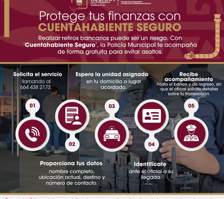 La Secretaría de Seguridad y Protección Ciudadana Municipal (SSPCM), a través del programa ´Cuentahabiente Seguro´, ofrece a la ciudadanía un servicio gratuito de acompañamiento policial para el traslado de divisas, ya sea desde un domicilio particular hacia una institución bancaria o viceversa, con el fin de prevenir delitos y proteger el patrimonio de las personas. Continúa leyendo Brinda SSPCM acompañamiento policial para el traslado de divisas a través del programa ´Cuentahabiente Seguro´
