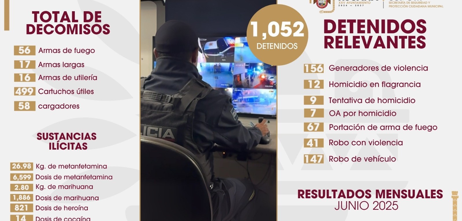 Con el respaldo de las cámaras de videovigilancia, la división de drones, así como áreas especializadas de la corporación como es la Unidad de Operaciones Caninas, Inteligencia Policial, y la Unidad Táctica Especial, la Secretaría de Seguridad y Protección Ciudadana Municipal, seguirá trabajando arduamente para eficientizar sus intervenciones y obtener mejores resultados en materia de seguridad para nuestra ciudad.