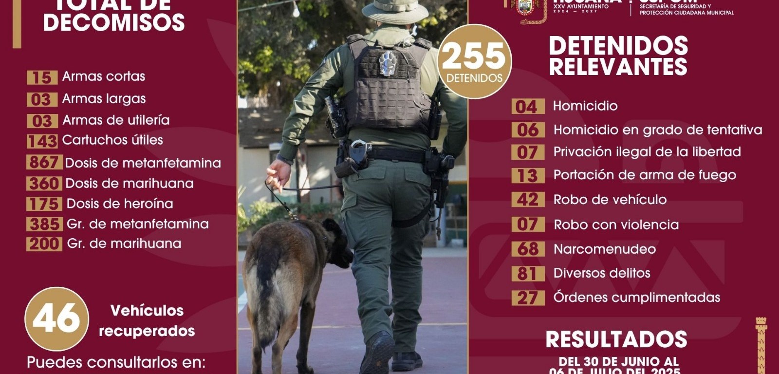 TIJUANA.- Derivado de las acciones preventivas implementadas por la Secretaría de Seguridad y Protección Ciudadana Municipal (SSPCM), durante el periodo del 30 de junio al 6 de julio de 2025, fueron aseguradas 255 personas como presuntas responsables de diversos delitos, así como el decomiso de 18 armas de fuego.